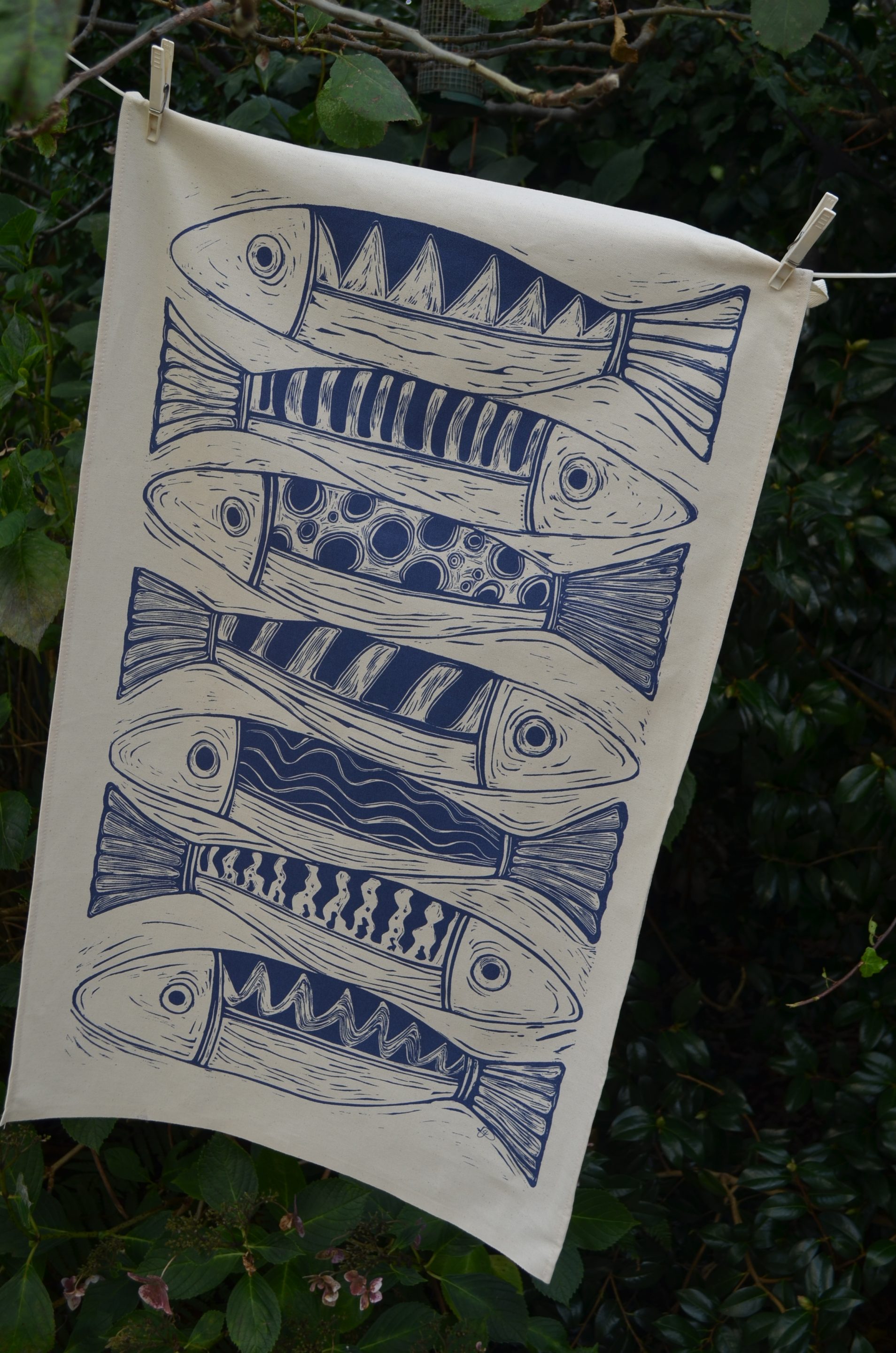This ethically produced unbleached organic cotton tea-towel has an attractive bold design taken from an original Lino-print evoking the spirit of freshly caught fish in Cornwall. Designed using an original lino-cut print, the dark blue fish catch your eye with their playful almost regular pattern.